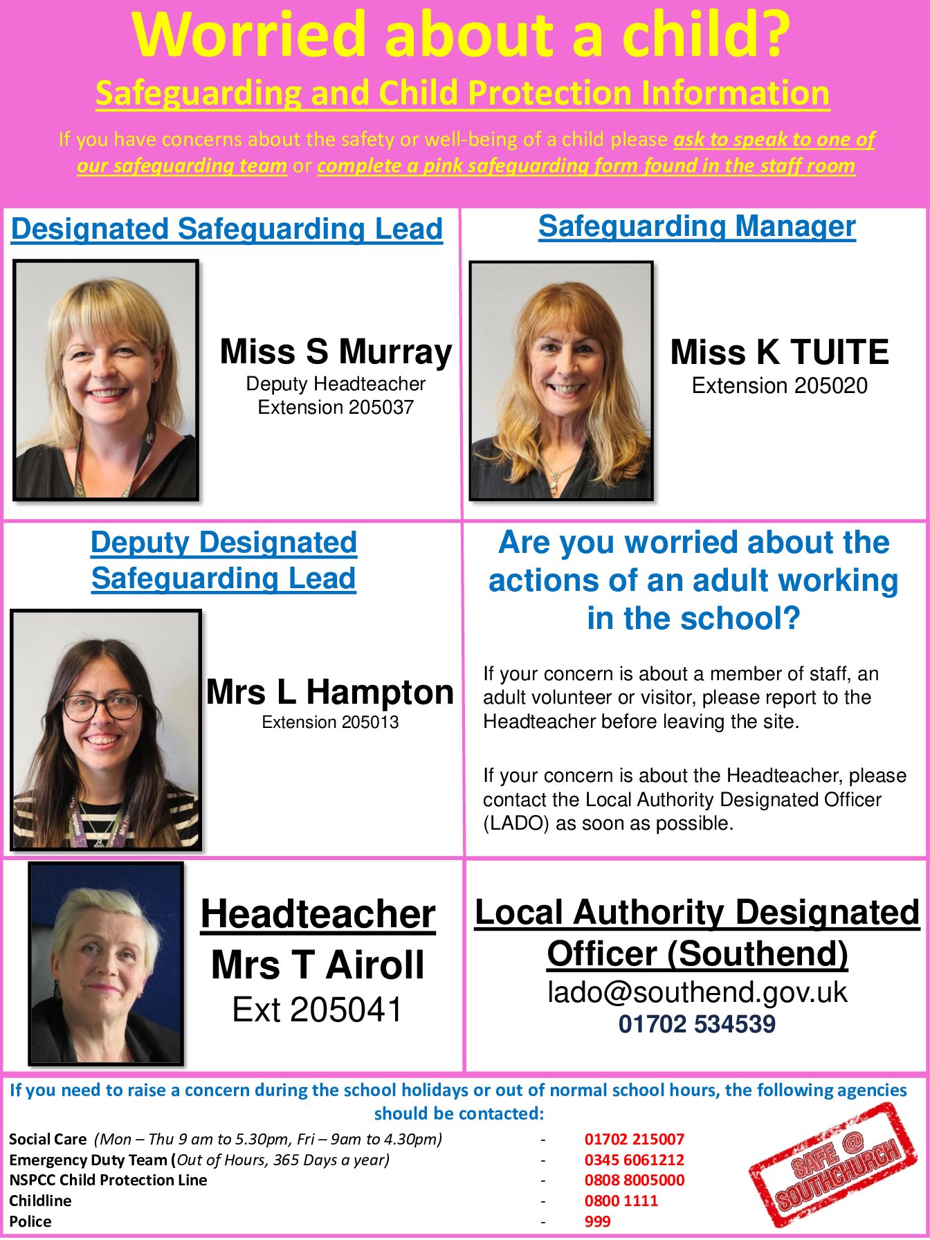 Southchurch High School is a safe learning environment where all students and adults feel safe, secure and valued and know they will be listened to and taken seriously. The school implements policies, practices and procedures which promote safeguarding and the emotional and physical well being of students and staff.