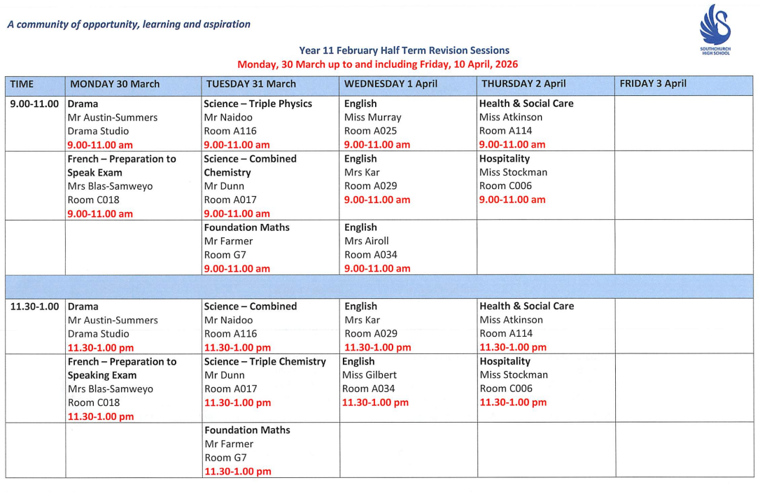 Y11 Easter Revision Timetable